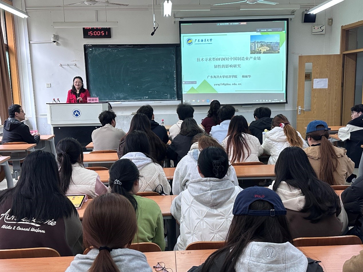 杨丽华教授围绕技术获取型OFDI对制造业产业链韧性的影响展开深度解读,系统阐述了研究假设、变量测度、实证结论等核心内容,重点分析了技术进步效应与要素配置效应的作用路径,结合异质性与空间效应分析提出针对性政策建议。她的分享兼具学术深度与实践价值,为师生理解全球投资与产业链发展提供了全新视角。现场师生与杨教授就研究数据应用、区域协同机制等问题展开热烈讨论,学术氛围浓厚。