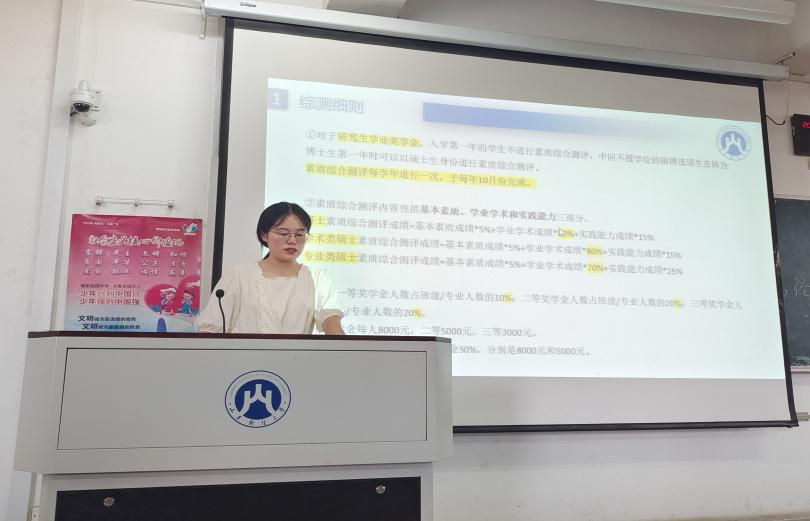 为了帮助研究生新生尽快融入新环境,顺利完成角色转变,9月8日上午,学院举行2023级研究生入学教育之“与优秀团体面对面”,助力研究生开启求学新征程。本次交流会邀请研究生党支部党的二十大宣讲团、研究生会的相关同学,为新生们讲解丰富多彩的学院活动。