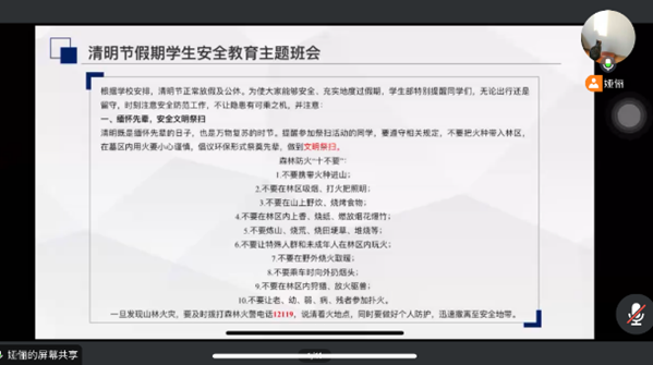 通过本次安全教育主题班会,有效提升了同学们的安全意识,形成了学院讲安全、重安全的良好氛围,为同学们度过一个文明、安全的清明假期筑牢安全保障。