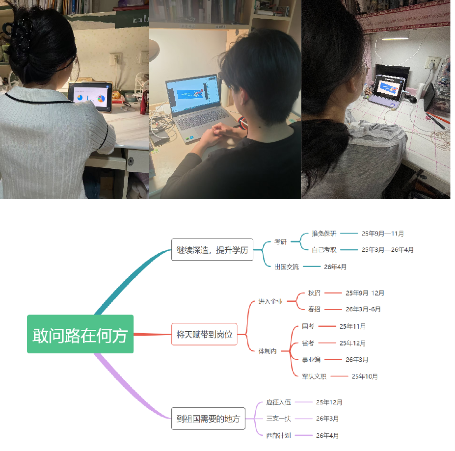 约28%的学生选择毕业后直接就业,主要有企业入职和考公考编两种方式。牟重阳肯定了“先就业再择业”的就业观,指出当前就业市场竞争激烈,这种观念可以帮助同学们积累经验,为未来的职业发展打下基础。对于企业入职的同学们,他建议从细节出发完善简历,通过关注学校及其他正规就业公众号获取招聘信息、练习面试等;针对想要备考公务员、事业编的同学们,他提供了时间线提醒和备考建议,鼓励同学们备考、就业两手抓。