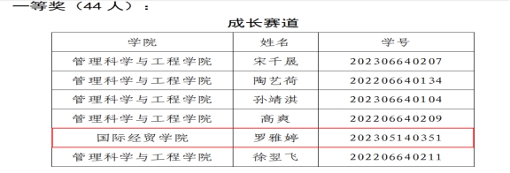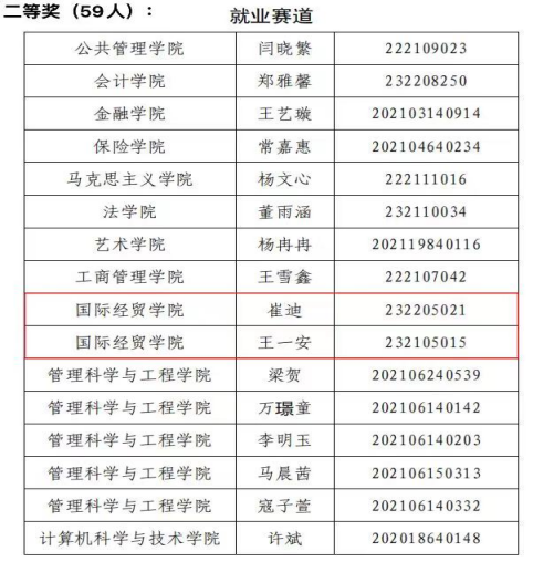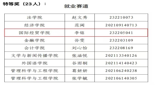 学子成绩喜人,共有5人获奖:本科生罗雅婷、陈可分别荣获成长赛道一等奖、成长赛道三等奖,研究生李铭荣获就业赛道特等奖,崔迪、王一安荣获就业赛道二等奖。