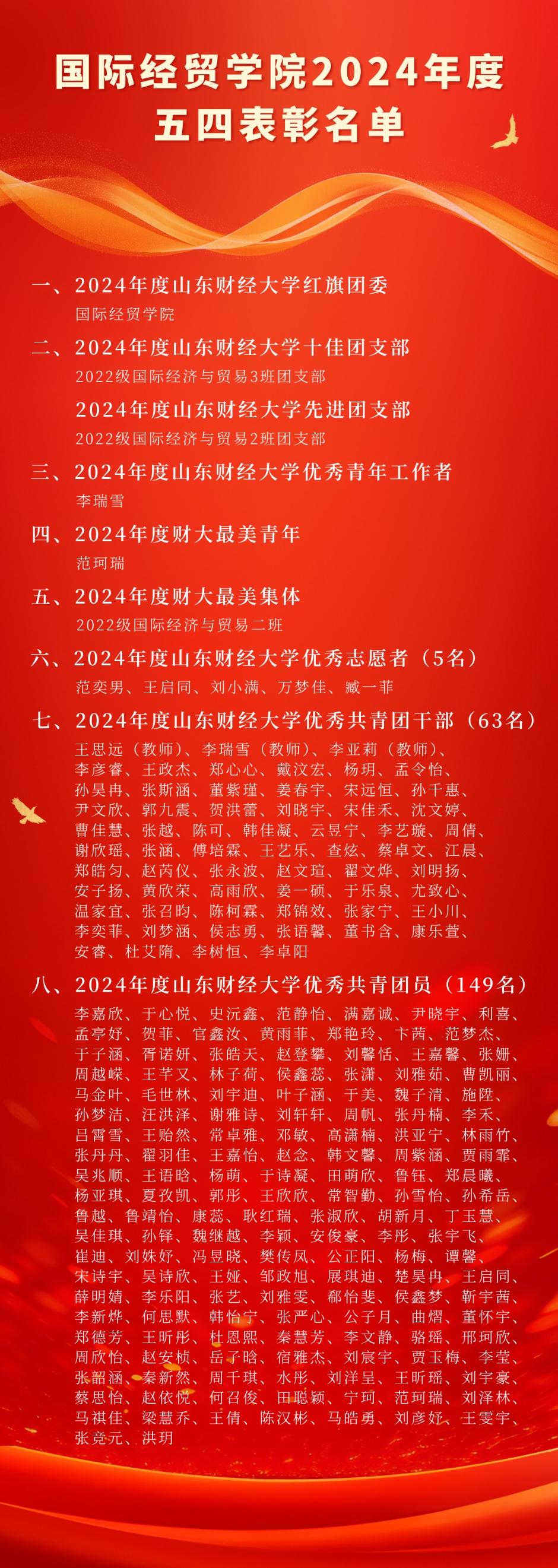红旗团委称号,2022级国际经济与贸易3班团支部荣获“十佳团支部”称号,2022级国际经济与贸易2班荣获“先进团支部”与“财大最美集体”称号,学院团委书记李瑞雪荣获“优秀青年工作者”称号,2023级国际经济与贸易(数字贸易创新)专业实验班学生范珂瑞荣获“财大最美青年”称号,5名学生荣获得优秀志愿者称号,学院3名教师和60名团员荣获优秀共青团干部称号,149名学生团员荣获优秀共青团员荣誉称号。