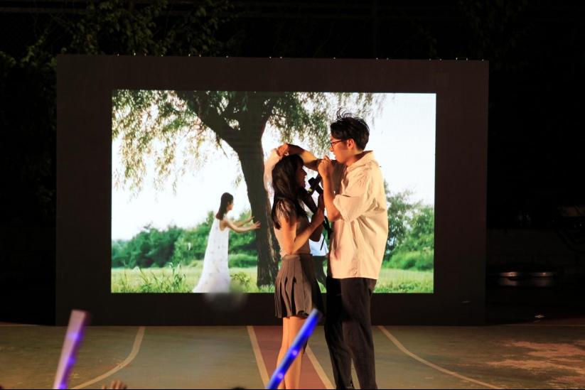 在暖场舞蹈《NOT SHY》后,毕业晚会正式拉开帷幕。晚会创新表演形式,采用毕业电影形式串联整场活动。两位2024届毕业生作为主演在深情回忆中演绎了校园生活的点点滴滴。