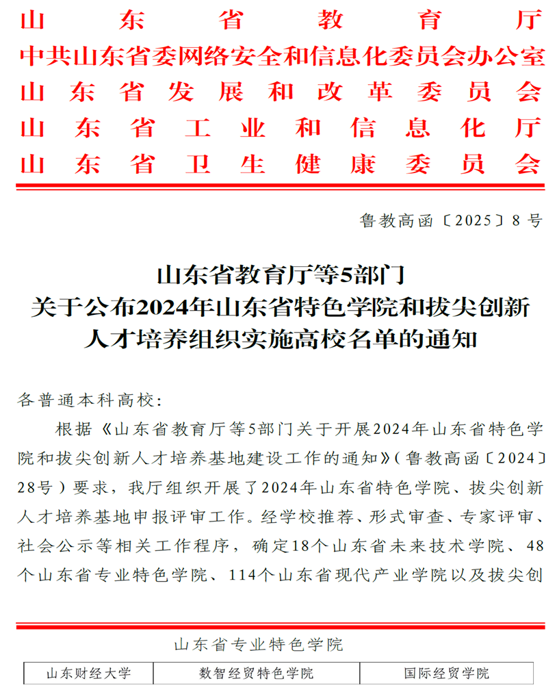 申报的“数智经贸特色学院”获批山东省专业特色学院。