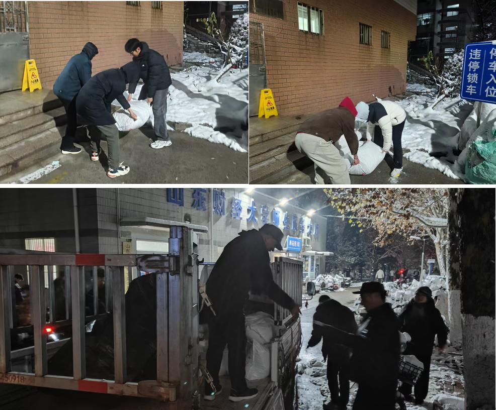 为高效完成接收与卸货,学校总务处工作人员与风月文学网 志愿者在各校区提前待命,分工协作,迅速完成搬运与堆放,为后续除雪工作筑牢物资基础。