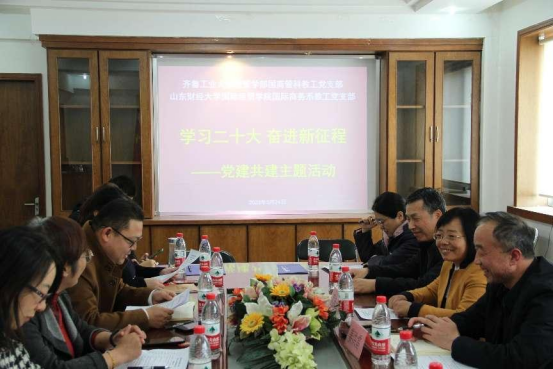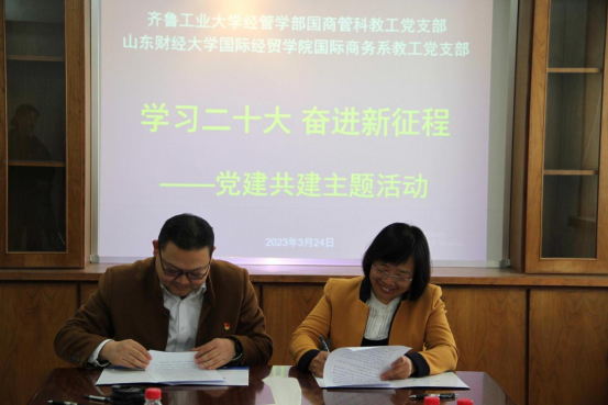 阳春三月,桃杏争春。3月24日下午两点,舜耕校区办公楼508室,国际商务系教工党支部与到访的齐鲁工业大学经管学部国商管科教工党支部成功开展“学习二十大·奋进新征程”党建共建主题活动并签署党支部共建协议。