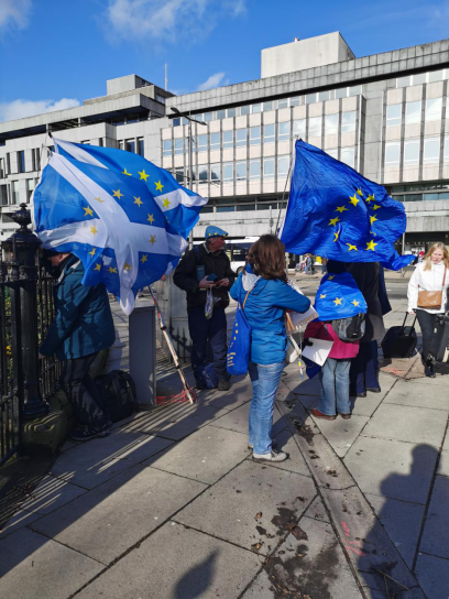 图 12 王子街街头反对脱欧者挥动着合二为一的苏格兰旗帜与欧盟旗帜