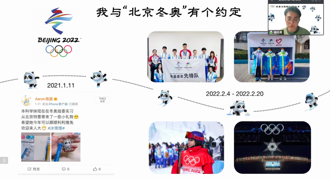 在欢快而又激烈的答题环节之后,小组风采展示环节更是将比赛推向高潮。参赛队伍依次进行风采展示,每支队伍向大家介绍了自己与冬奥的故事。我要冰墩墩队的杨向南同学以“我与‘北京冬奥会’有个约定”为主题,讲述了自己从本科以来和冬奥会的诸多缘分。