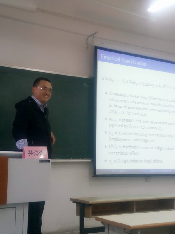 樊海潮博士以中国加入WTO为例从产品质量的角度实证分析了贸易自由化对企业生产率的影响。研究发现,贸易自由化之前,较低生产率企业生产的产品质量较差,但关税下降后这些低生产率的企业却相对更积极的使用高质量的中间投入品,生产更高质量的产品。贸易自由化前的较低生产率企业更有可能在贸易自由化后,进入到对高质量产品需求更多的发达国家市场,同时进一步缩小其与之前高生产率企业在产品质量上的差距。海潮博士还与我校师生进行了交流讨论,针对贸易研究中的工具变量选择,实证结果的解读等问题进行了一一解答。