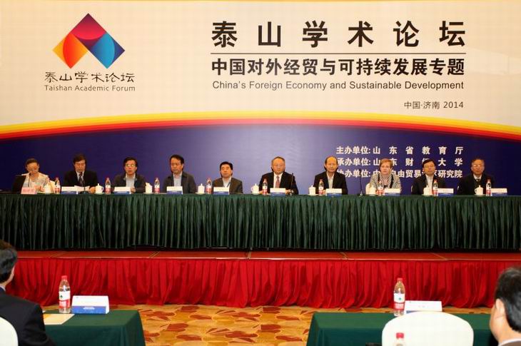 10月24-26日,由山东省教育厅主办、我校承办的“泰山学术论坛—中国对外经贸与可持续发展专题”国际研讨会在山东政协大厦举行。山东省教育厅副厅长宋承祥,中国对外经贸大学副校长林桂军,长江学者、中国APEC研究院院长盛斌,中国社科院财经战略研究院于立新,捷克布拉格经济大学Ludmila,以及来自美国特拉华大学和马歇尔大学、荷兰大学、加拿大达尔豪斯大学和阿卡迪亚大学、韩国中央大学和中国社会科学院、商务部对外贸易经济合作研究院、中国人民大学、南开大学等30所国内外高校和科研机构的专家学者出席开幕式。山东省教育厅为本次论坛发来贺信。党委书记、校长刘兴云出席开幕式并致辞,开幕式由副校长聂培尧主持。