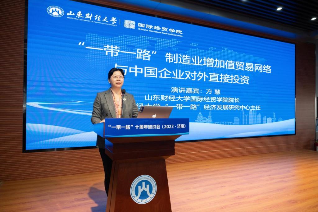 院长、“一带一路”经济发展研究中心主任、山东省国际贸易重点学科首席专家方慧教授发表了题为“‘一带一路’制造业增加值贸易网络对中国企业对外直接投资的影响研究”的主旨演讲。方院长主要基于当前全球价值链正在加速重构,尤其是制造业产业链重新布局的大背景,针对我国‘一带一路’制造业增加值贸易网络对企业对外直接投资的影响进行阐述,具体通过详细深入的实证研究,对“一带一路”贸易网络所呈现的演变特征,及其对中国企业的对外直接投资的影响路径和效果进行了全面分析,并从“一带一路”机制、政府政策及企业发展等多个角度,提出了具备指导意义的政策建议。